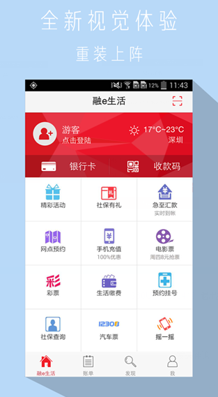 融e生活安卓版是深圳工行官方出品的移动手机客户端,致力打造一个全流程综合金融服务平台,为客户提供全方位、多样化的移动金融服务。只要您拥有深圳工商银行卡,就可享受到免手续费实时转账汇款、银行卡信息查询、工行网点预约、二维码扫码转账、手机充值、电影票、医院预约挂号、汽车票、生活缴费、社保查询等便民生活服务 很安全、超快捷、够方便!