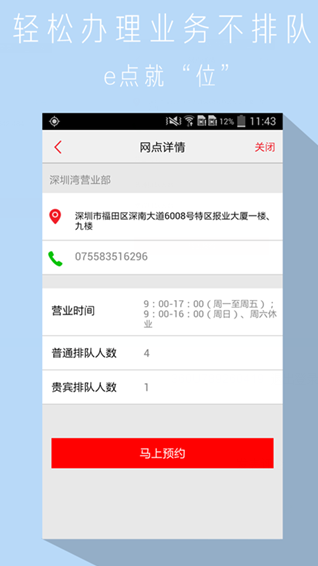3.网点预约:打开手机就可预约排号,免除您的排队烦恼。(支持该功能的网点持续增加中)