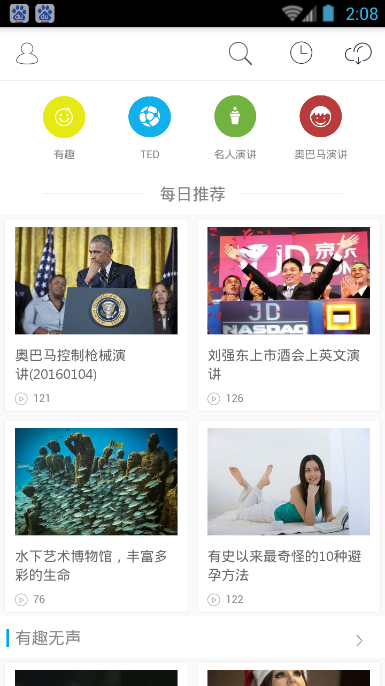 每日英语视频是一款非常好用的英语学习了软件,给用户提供了大量的国外英语视频,您可以使用每日英语视频app观看奥巴马演讲等感兴趣的英语原声视频,联系纯正的英语发音,欢迎下载使用。