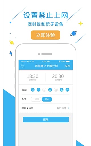 3、上网时间控制:可自由设置孩子端手机上网时长,超过时间孩子手机即自动锁屏。