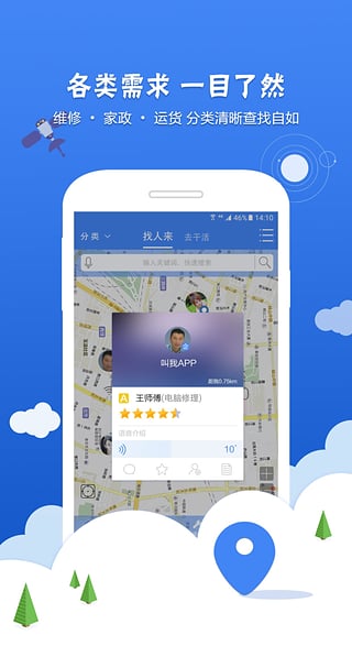 叫我,改变你的创业习惯,改变你的工作时间!叫我,人人都能创业!如果你喜欢家装设计..如果你会修电脑、修手表..每项技能都能变成零花钱,每天都能帮助周围需要帮助的人,成为手艺人,有事来叫我!叫我,认识你想不到的手艺人,快速找到你想要的服务,发现自身技能帮助身边的人!