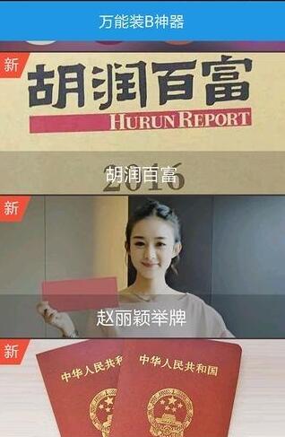 一键生成带你名字的豪车证、明星微博@ 、表白装B、明星嘉宾等各种装备神图等;装B神器助手,让你一秒变土豪,瞬间成为朋友圈中风云人物,享受瞬间而来的土豪快感;要装B,就用装B神器助手。