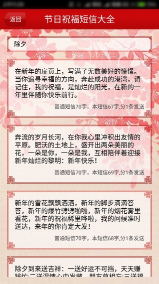 节日祝福短信大全是一款手机短信祝福语大全软件,节日祝福短信大全通过短信微信等应用给发送节日祝福给家人和朋友,还可以通过分享功能分享到其他途径传播祝福信息。