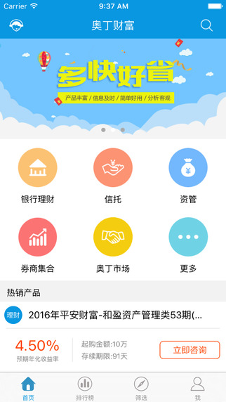 奥丁财富是以“综合搜索、跨类比较”为核心的理财产品搜索平台。 投资者可在线搜索银行理财、信托、资管、券商集合、阳光私募等各类金融机构全部在售产品信息,提供理财产品咨询、比价、预约、购买等专业服务。官网首页有各个产品的分类栏,按照投资需求点击即可。