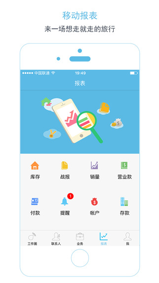 6.移动报表今日库存、今日战报、今日销量、今日营业款、今日付款、账务余额,不在办公室,一样查数据;