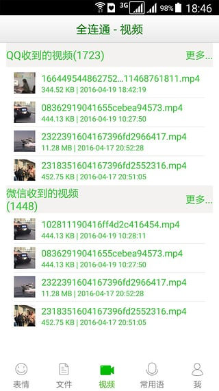全连通app软件是一款手机微信视频管理软件,可以非常方便的来管理手机中的微信小视频,让你可以将微信小视频进行备份,以免数据丢失,还可以将视频打包保存到电脑中。