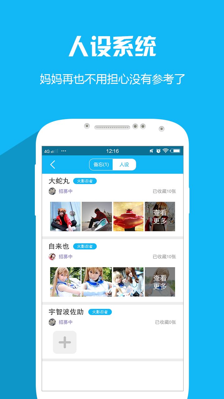 量身定做你的拍摄计划,更好更便捷的管理你想要拍摄的计划,出拍备忘实时提醒,妈妈再也不用担心我忘记带小道具了!让我们成为你的贴心小棉袄。与此同时你还可以加入他们创建的拍摄计划,各种动漫的拍摄计划应有尽有,满足身为COSER,摄影,后勤,妆娘等各种身份的你