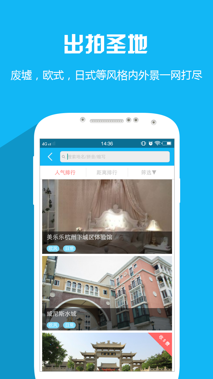 全国各地COS外景场地实时更新,废墟,欧式,日式等风格内外景一网打尽,只为让喜欢COS的你找到更好的场地,选择更好的景,出更好的片!与此同时玩家还能与广大COS玩家分享外景地,吃水不忘挖井人。