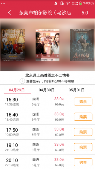 掌上电影订票网上电影票预订软件。提供的电影院放映资讯即时搜索服务,是国内覆盖影院最全最多、放映资讯最及时最准确的查询系统。 免费应用,让手机能够随时随地查询电影放映场次以及影院相关资讯。