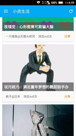 小资生活app是一款阅读类软件,在各种信息让人应接不暇时,小资生活app为用户精选信息,根据用户浏览兴趣,推荐阅读内容,这里主要提供新鲜事,无聊图,妹子图和段子,选择你喜欢的,轻松阅读吧!