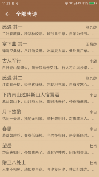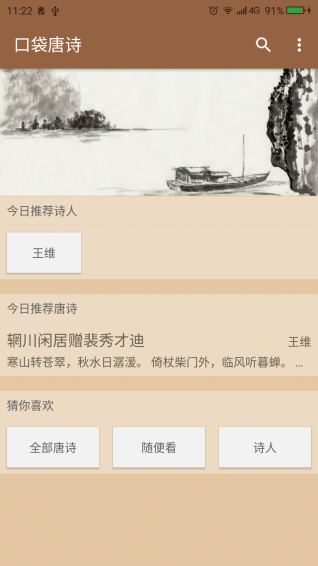 口袋唐诗app是一款阅读类软件,下载口袋唐诗app,将唐诗装进手机里,想阅读哪位诗人的诗,阅读什么内容的诗,搜一搜就出来了,操作简单,还有合适的文字颜色搭配,减轻你的视觉疲劳,轻松阅读。