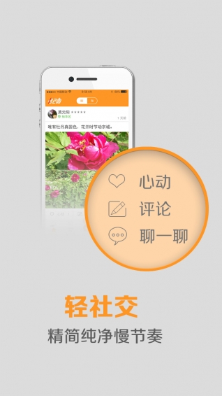 移动终端随时关注生活点滴,精简化的社交互动,清新的社交环境,你可以敞开心扉自由自在交流互动。