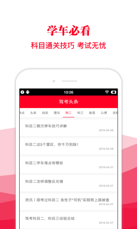 在驾考头条app,你能看到科目一、科目二、科目三、科目四海量学开车技巧、驾考政策新变化、考试注意事项、学霸经验分享等。