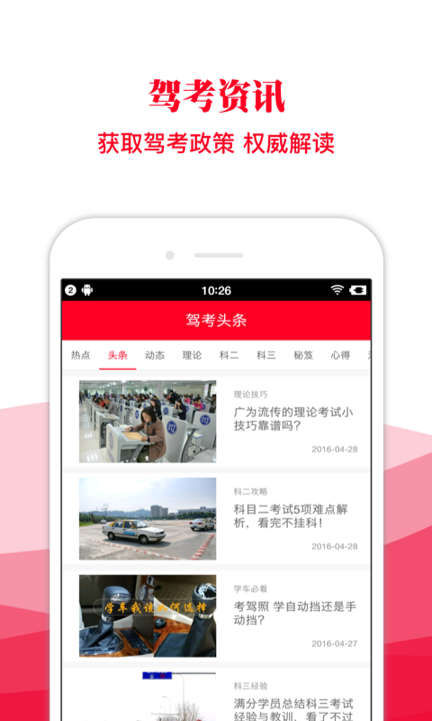 驾考头条app是一款服务全国广大驾考学员、学车必备驾考新闻资讯手机宝典应用。驾考头条打破消息、政策不对等,及时传递全新驾考相关动态。