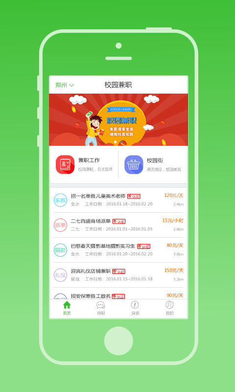 3.该APP共搭建了三种,分别为兼职平台、校园街平台、资讯平台