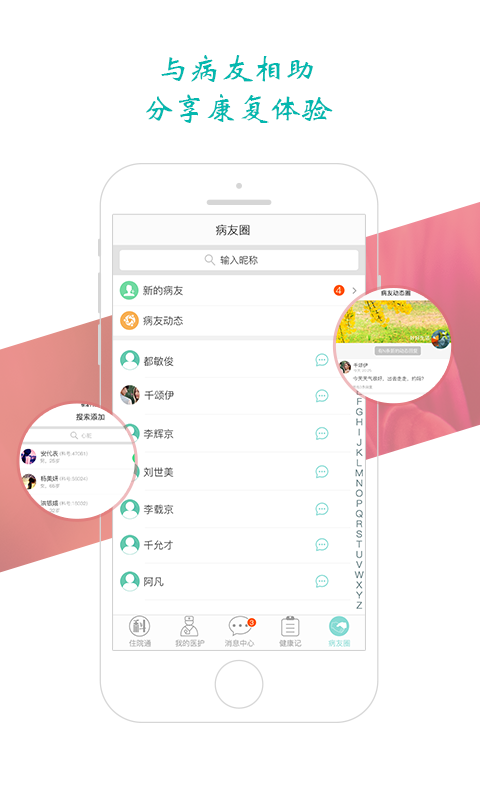 病友圈-结识同类病友,交流康复体会。