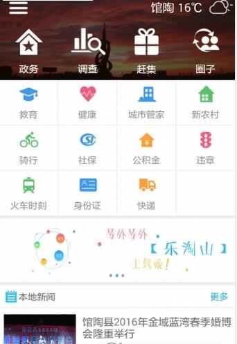 乐陶山app是馆陶县政府打造的应用,能随时查看馆陶县的各种新闻,知晓各种最新的政策,能在线预约医疗服务,更拥有各种娱乐信息查看,是馆陶县政府发布的智慧城市手机门户app。该应用“接地气,惠民生”市民使用乐陶山可充分享受移动互联网时代社交、娱乐、政务、医疗等多项服务,让市民生活,锦上添花是馆陶县生活的好帮手。