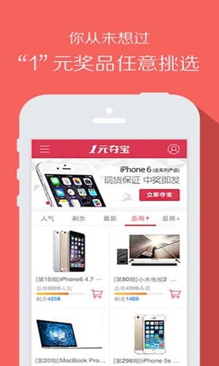 就要夺宝手机版是一款网络购物软件,您只需要花费一元就可以参与一次我要夺宝,最后等待开奖,系统根据规则计算出一个幸运号码,持有该号码的用户,直接获得奖品。快来下载吧!