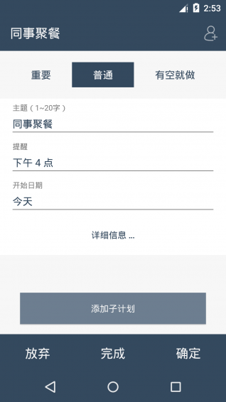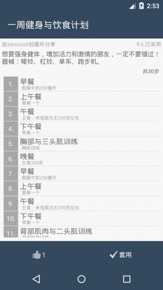 当前版本号:V0.8.75。支持模板、圈子和活动功能。用户可以一键套用复杂的模板,无需自己逐个新建计划;可以通知其他用户一起参与到计划中来;可以关注感兴趣的公共活动通知。