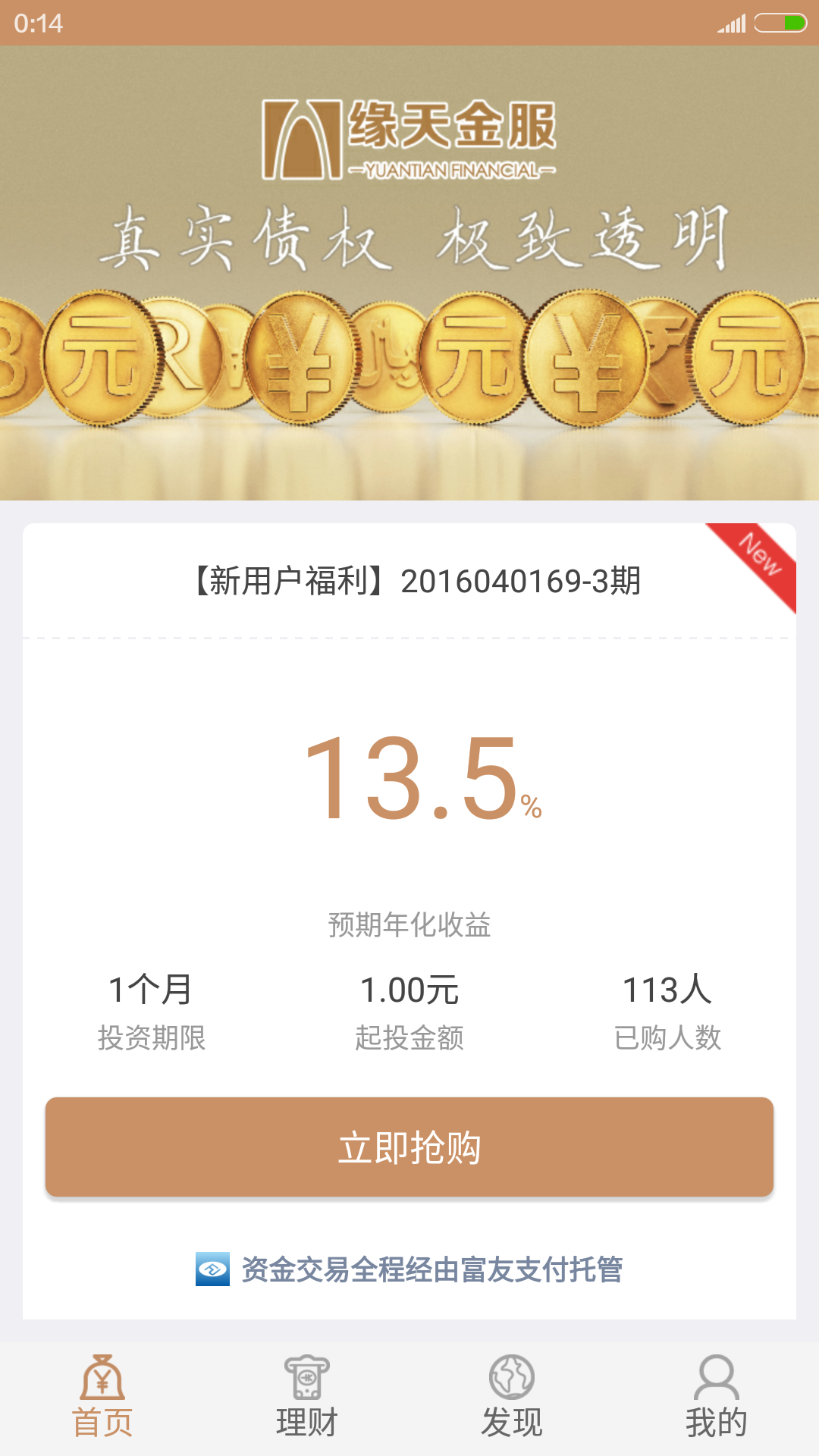 现已开发功能全面版本,开放注册,欢迎大家体验投资理财。理财数据与网站数据同步,每日提供新用户福利,收益高达13.5%。