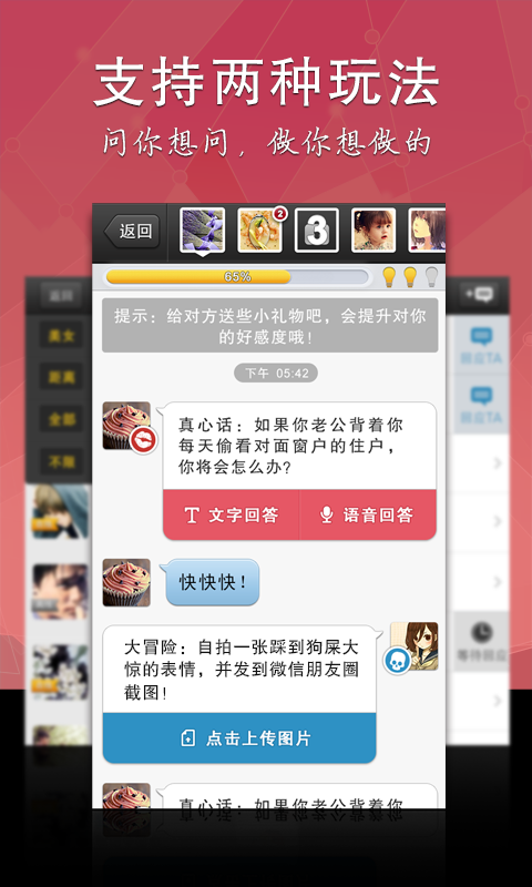 全球首款与真人互动的Truth Or Dare(真心话大冒险)社交游戏,你可以在这里找到同样爱好玩这个游戏的男男女女,好玩,刺激的问题,问你不敢问的,做你不敢做的,敢聊,就放马过来吧。。
