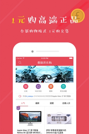 香肠欢乐购app是一款新潮有趣的众筹购物手机应用,在香肠欢乐购app,你可以参与丰富的众筹活动,实现自己一元获得热门潮流商品的愿望,欢迎加入。
