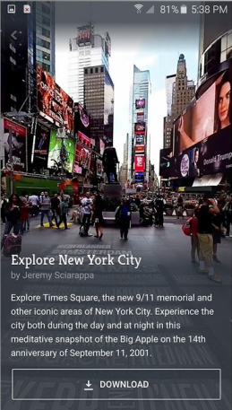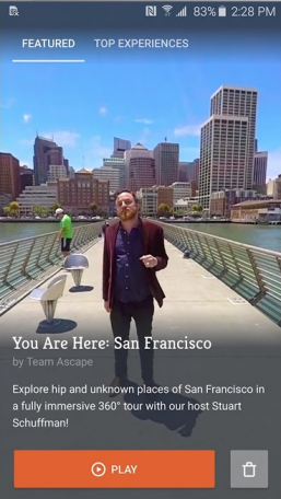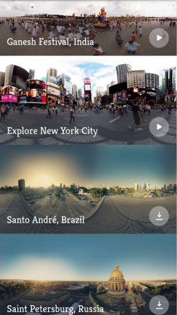 现在,您可以身临其境地体验由由市长候选人担当导游的旧金山360度虚拟现实之旅,探索佩特拉的古老庙宇,在圣彼得堡上空飞翔,与博茨瓦纳的大象一起漫步,甚至与海豚一起游泳,一切通过您的智能手机实现。下载之后,您就可以离线观看旅行视频。