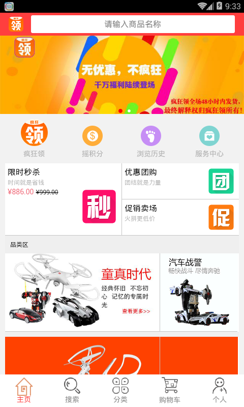疯狂领app是一款手机购物应用,疯狂领app为用户提供海量的特价商品,让用户体验疯狂实惠的购物方式,一站式购物,让购物更划算。