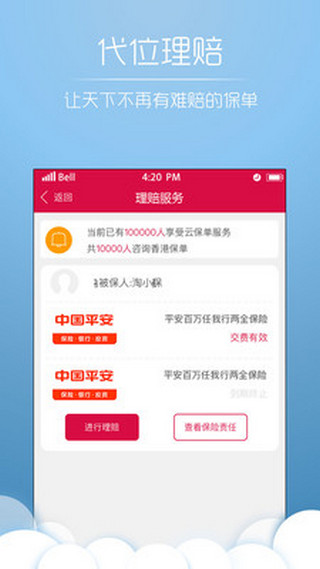 云保单是中国第一家提供保单管理的e站式云服务平台。该平台是以客户利益最大化为出发点,以便捷用户的e站式云服务为核心理念,为1.98亿已经购买保险的用户提供在线“保单托管”,“保单体检”,“代位理赔”,“法律援助”,“保单质押”,“保单贴现”,“帮你找保险”。