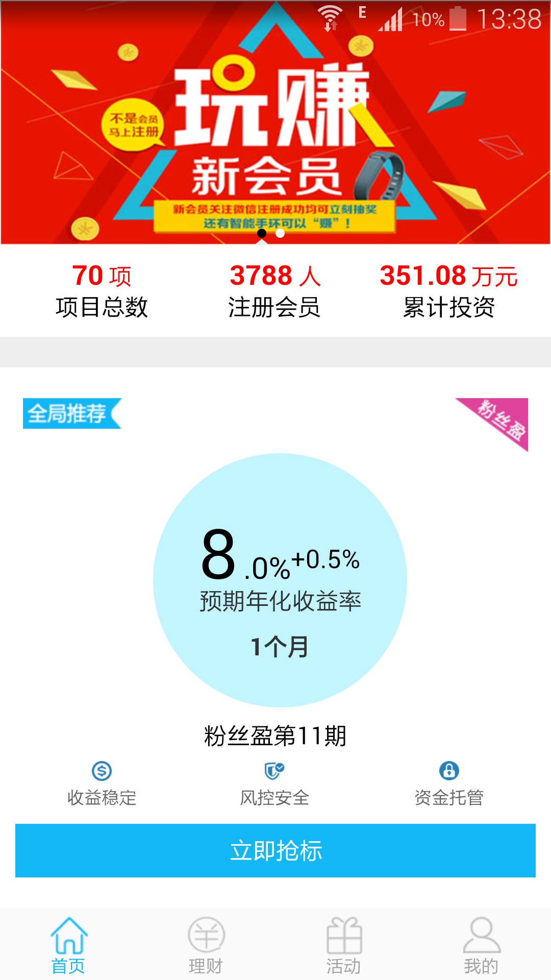 上海全局互联网金融信息服务有限公司手机端APP,主要包含了个人理财、消费金融、APP活动等相关内容。 【更新内容】【新手注册,专享福利】 1.注册即送50元福利红包 2.百元起投,收益稳定 3.专业风控,项目可靠 4.账户托管,资金安全