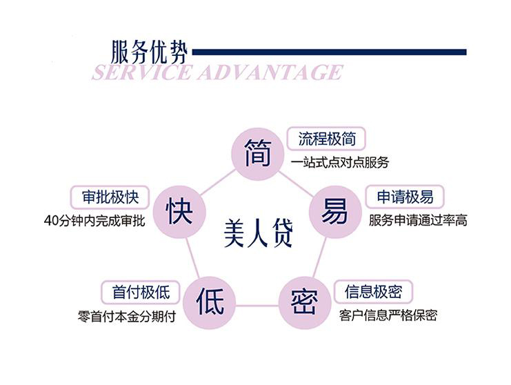 2.“美人贷”消费分期服务集合了利率优惠、手续简便、审批极快、申请极易、首付极低等优势为一体,该服务重要的特点是“零首付”和“一站式服务”。