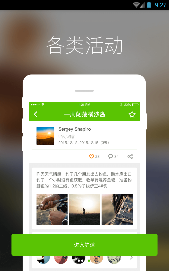 钓道app是由上海钓道网络技术有限公司3位热爱钓鱼的互联网人士共同创建,公司致力于打造最佳服务体验的钓鱼平台。在这里你可以找到适合自己的圈子,志同道合的朋友,专属定制的活动。大家汇聚在一起探讨钓鱼的技巧,分享收获的喜悦。同时也会有各类主题钓鱼比赛和游钓活动,所谓缘聚你我,游钓天下!