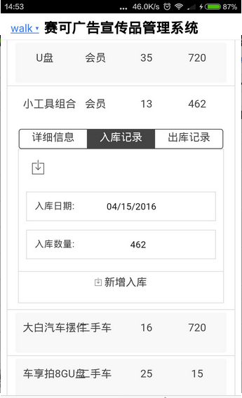 2、主要功能包括库存余量管理,出库入库登记,数据汇总与统计等;