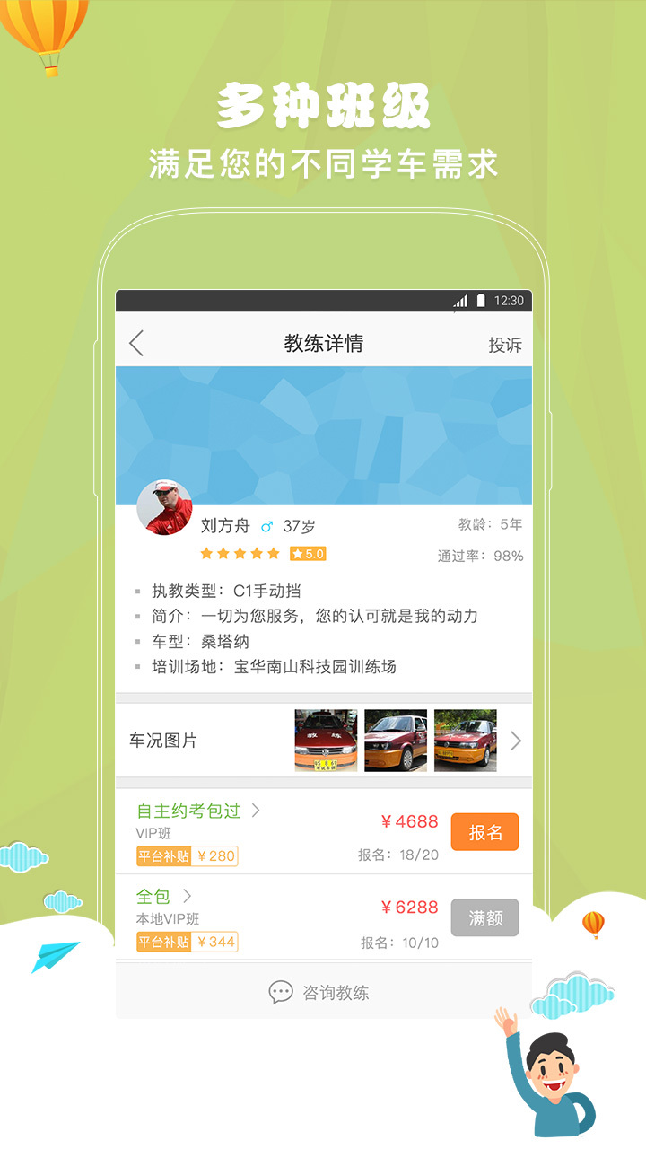 选择教练:地理位置匹配教练,根据自己喜好,随意选择教练。