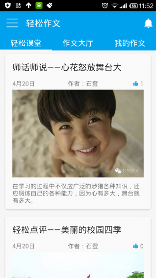 轻松作文app是一个作文在线交流平台,作为学生,可以将自己的作文发表在轻松作文app上,让老师和家长来点评,不仅可以帮助自己提高作文水平也可以在这里欣赏他人的作文内容。