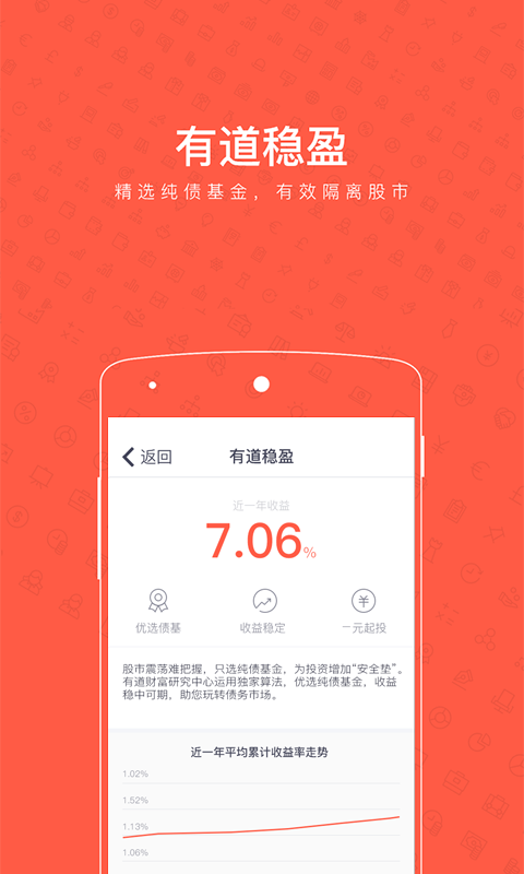 “有道财富”是嘉银金融旗下独立的一站式智能化财富管理平台,从3000多只基金中优选出前10%的货币基金、债券基金、股票基金,再结合现代组合投资理论及风险计量模型,采用高效算法,针对用户个性化需求,提供资产组合配置建议,实现一键化智能理财。团队成员均来自阿里巴巴、国泰君安证券、汇丰晋信基金、天天基金等知名互联网平台及财富管理机构。