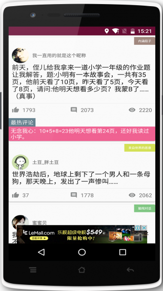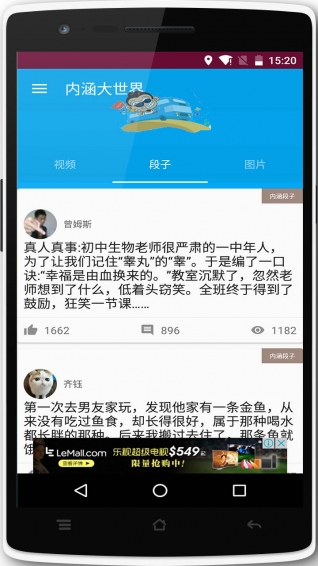 内涵大世界app是专为笑话查看打造的应用,能随时查看各种优质的段子,各种爆笑视频,支持在线评论各种段子,更支持各种逗逼视频查看,是您打发业余时间的好帮手。