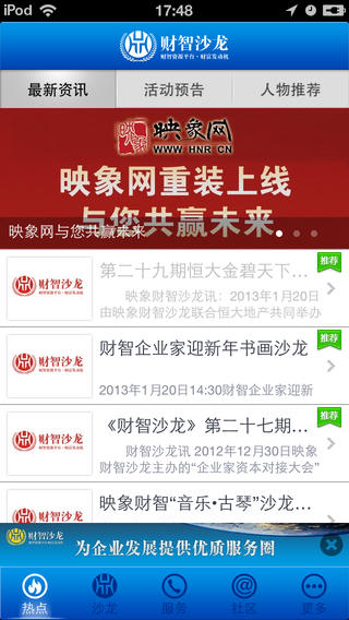 “财智沙龙”移动APP,联合优秀企业家所构建的财智资源平台、集服务、分享、传播为一体的移动终端应用。