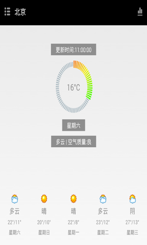 天气小助手以简介的画面向使用者及时准确的获得当日最新的实时温度信息,空气质量和气候条件,更可以提前获得未来一周的天气情况,配合图表可以更加方便和直观的了解未来七天的天气变化走势