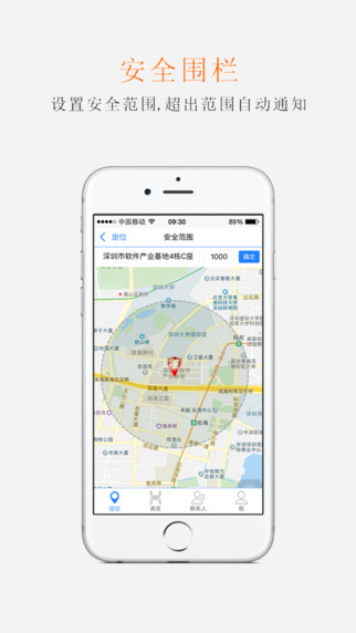 3、安全围栏:家长可以设置以某一地理位置为圆心的安全范围,孩子如果越过此范围,华诺家长端将收到短信提醒。