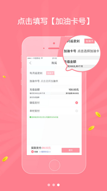 根据你每月的油耗,选择最优折扣套餐,每月加油卡充值到账后直接圈存加油。