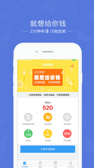 快速:5分钟完成申请,实时确定信用,最快10分钟放款;