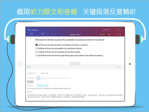 Practice功能:阅读听力文本中英文对照翻译;详尽的答题思路和解析;听力题截取对应原文及音频反复精听