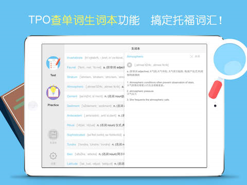 Test功能:还原最真实的考试环境,从界面到流程完全模拟托福机考,阅读听力按照托福官方标准智能打分。知己知彼,应对考试从容不迫~
