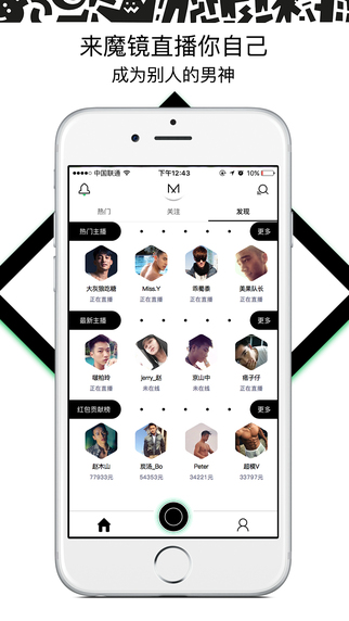 任何男生,只要你愿意显示你的魅力,或者健身、游泳、绘画、外语、厨艺……等等,都可以加入魔镜直播,成为别人的男神!