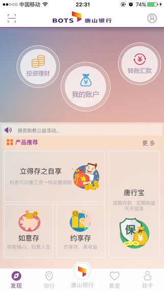 1、创新存款产品,支取灵活、保障本息,唐山银行为客户打造了手机银行专属存款产品,可获得更高的收益回报,包含整存整取、约享存、如意存、立得存、幸福1+1等,保障本息。更有手机银行专属活期产品唐行宝,随用随取的同时依然享受高收益;