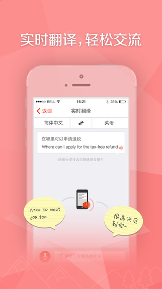 支持22种语言实时翻译,直接说话或输入文字,即可翻译为目标语言,并自动播放语音,方便与当地人交流;