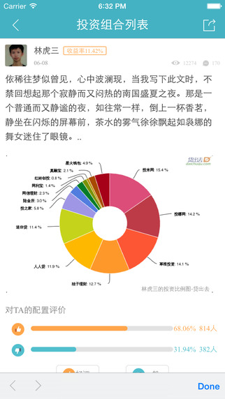 参考别人的,然后决定自己的。通过投资组合,可以看到别人是怎么理财的——P2P、基金、股票投资配比和投资金额,从而指导自己进行合理搭配。同时,通过分享自己的投资组合,还能获得其他投资人的专业点评和投资建议,实现投资优化。
