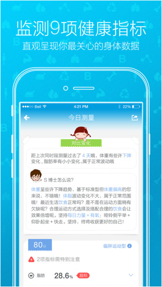 检测9项体质指数、6项生活指数、体重体脂肪率和BMI,