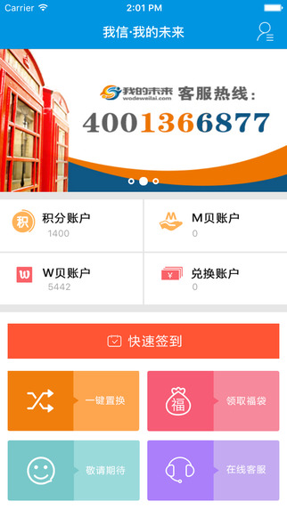 App提供了注册登陆、签到、领取福袋、一键置换、查看修改个人信息等功能。
